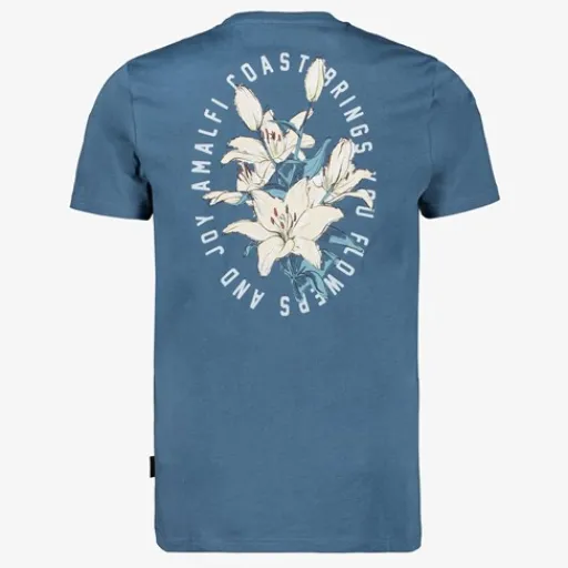 Blauw T-shirt voor heren. Voorzien van korte mouwen, een ronde hals en een grote backprint met bloemen en tekst. Het shirt is gemaakt van 100% katoen.