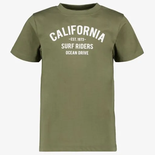Groen T-shirt voor jongens van Unsigned. Voorzien van een hoge, ronde hals, korte mouwen en een tekstopdruk aan de voorzijde. Gemaakt van 100% katoen.