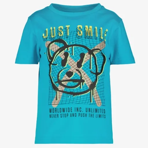 Blauw T-shirt voor jongens. Voorzien van korte mouwen en een ronde hals. Het shirt heeft een tekstopdruk met beer aan de voorzijde. Gemaakt van 100% katoen.