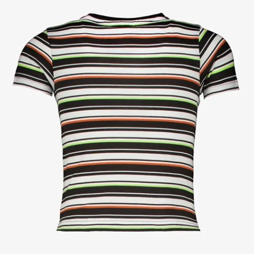 Jongens T-shirt van Unsigned. Voorzien van korte mouwen en een ronde hals. Het T-shirt heeft strepen in de kleuren zwart, wit, oranje en groen. Gemaakt van 100% katoen.