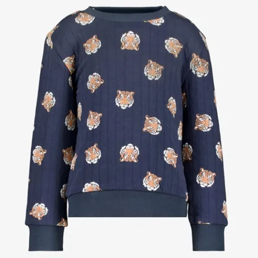 Blauwe sweater van Unsigned voor jongens. Deze stoere trui is voorzien van een all over print met tijgerkoppen. Hoe stoer is dat? De trui heeft een hoge, ronde hals en lange mouwen met elastische boorden. Gemaakt van 100% katoen met een fleece binnenzijde.