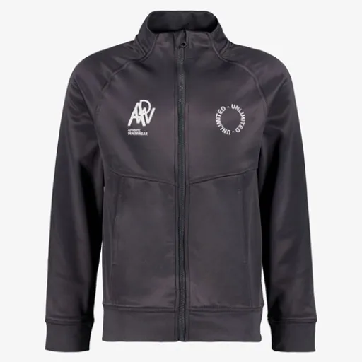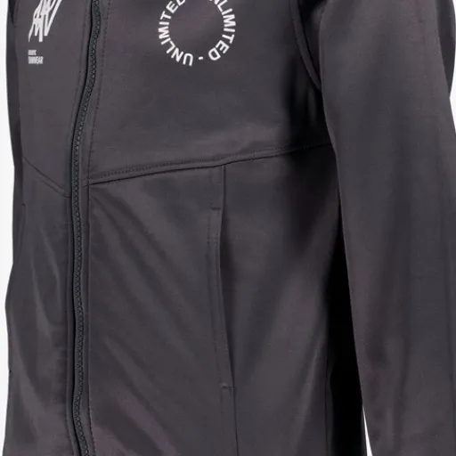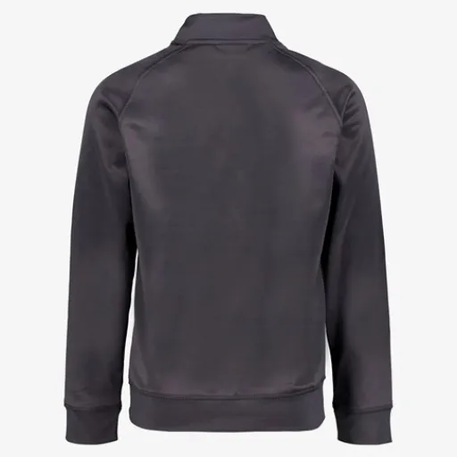 Donkergrijs vest voor jongens. Voorzien van een ritssluiting met kinbeschermer, elastische boorden en twee steekzakken. Het vest heeft een opdruk op de borst en is gemaakt van 100% polyester.