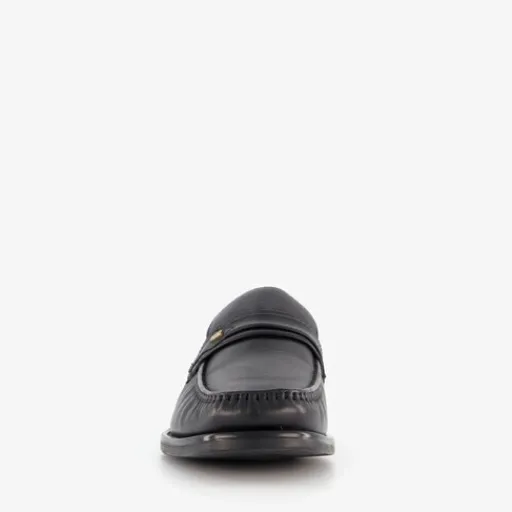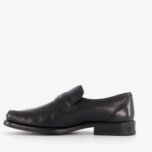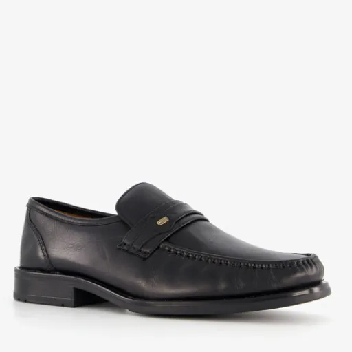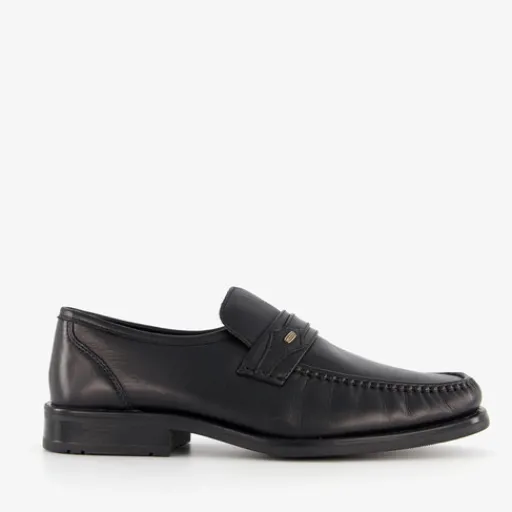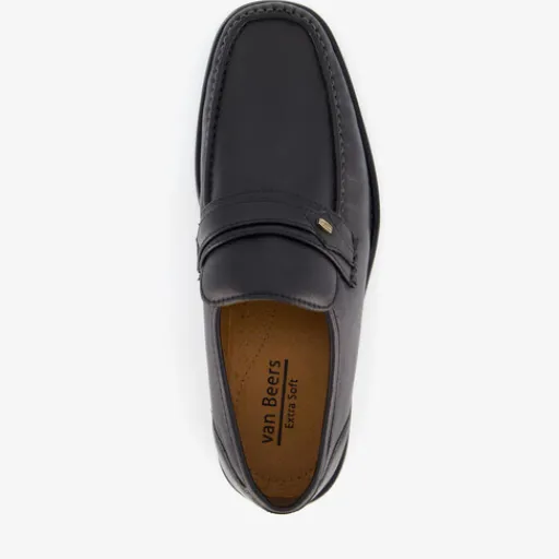Zwarte, nette Van Beers instappers voor heren. Ideaal voor op kantoor of om te dragen naar een feestelijke gelegenheid. Het buiten- en binnenwerk zijn gemaakt van leer en de buitenzool van rubber. Voorzien van een elastische instap en een uitneembare binnenzool van leer. De schoenen hebben een laag hakje van circa 1 cm.