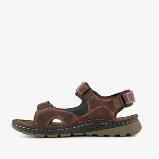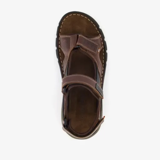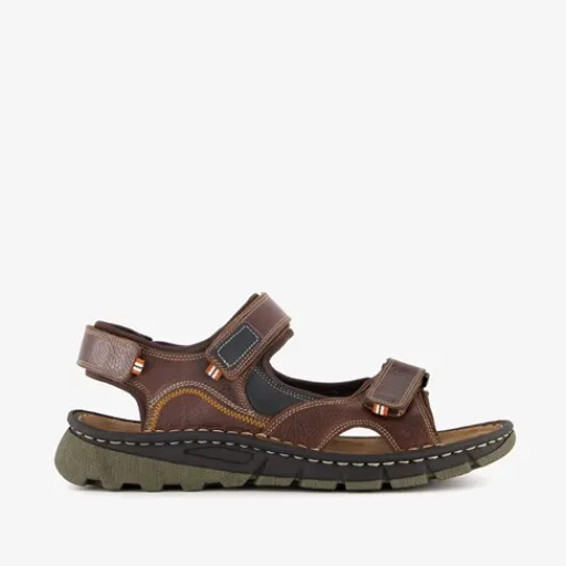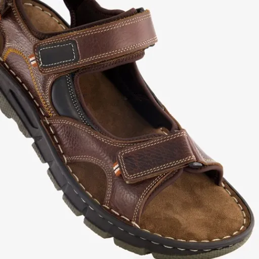 Cognackleurige sandalen voor heren uit de Van Beers. Het boven- en binnenwerk zijn gemaakt van leer en stevige zool met profiel is van rubber. Voorzien van klittenbandsluitingen bij de tenen, enkel en op de hak voor een makkelijke instap. De sandalen hebben comfortabele binnenzool van leer.