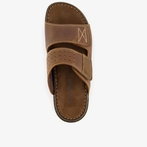 Cognac bruine heren slippers uit de Van Beers collectie. Gemaakt van leer, een binnenwerk van leer en een rubberen zool. De slippers hebben twee klittenbandsluitingen voor een optimale, aansluitende pasvorm. Het comfortabele voetbed is gemaakt van leer.