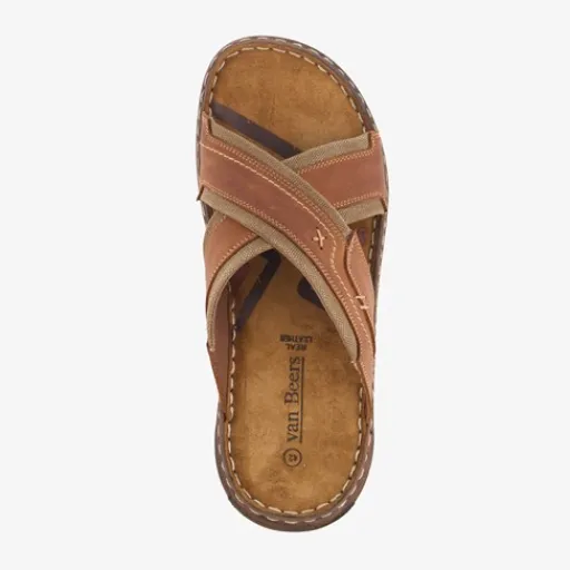 Cognac bruine slippers voor heren uit de Van Beers collectie. Het boven- en binnenwerk zijn gemaakt van leer en de stevige zool is van rubber. De slippers hebben een comfortabel voetbed van leer en een brede voetband met openingen.
