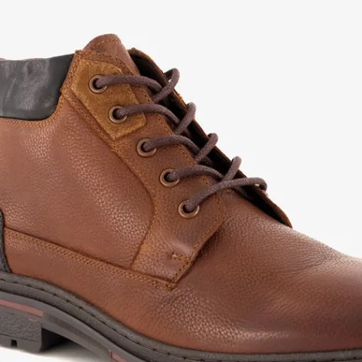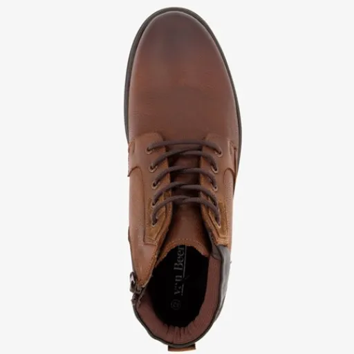 Bruine veterboots voor heren uit de Van Beers collectie. Het buitenwerk is gemaakt van leer, het binnenwerk van textiel en de profielzool is van rubber. Voorzien van een rits- en vetersluiting en aantreklusjes aan de achterzijde. De schoenen hebben een comfortabele binnenzool van leer en zijn helemaal gevoerd. Binnenzool is niet uitneembaar.