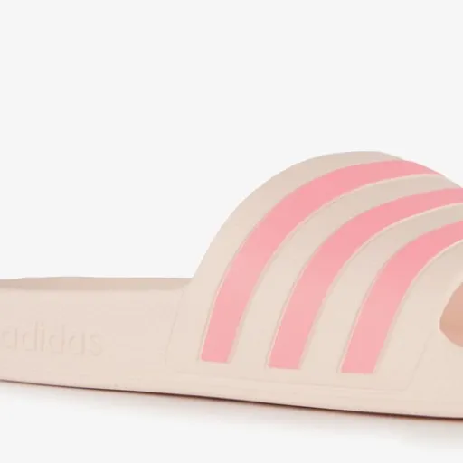 Beige Adidas Adilette badslippers met roze 3-Stripes. Deze badslippers voor dames hebben een instapperconstructie, wreefband van gegoten EVA en een stevige EVA loopzool. Het zachte, Cloudfoam voetbed biedt comfort. De badslippers voelen licht aan en zijn vervaardigd van sneldrogend materiaal, waardoor ze ideaal zijn voor een dagje zwembad, sauna of onder de douche. De stevige buitenzool biedt demping en verwent de voeten met luxe comfort.