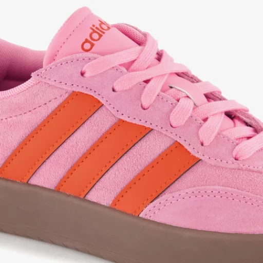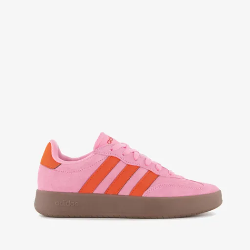 Roze Adidas Barreda sneakers voor dames. Het bovenwerk is gemaakt van leer en imitatieleer, het binnenwerk van textiel en de profielzool is van rubber. Voorzien van vetersluiting en comfortabele binnenzool van textiel. Deze is niet uitneembaar. De sneakers hebben een bruine buitenzool en op de zijpanden zijn rode Adidas 3-Stripes aangebracht.