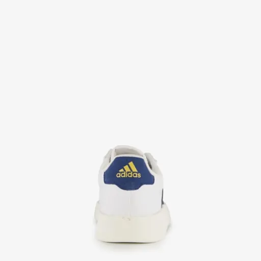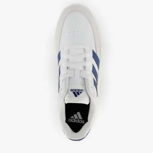 Witte Adidas Breaknet 2.0 sneakers voor heren. Het buitenwerk is gemaakt van imitatieleer, het binnenwerk van textiel en de stevige zool met profiel van rubber. De schoenen hebben de iconische 3-Stripes in het blauw aan de zijkanten en blauwe merkopdrukken op de tong en de hak. Binnenzool is niet uitneembaar.