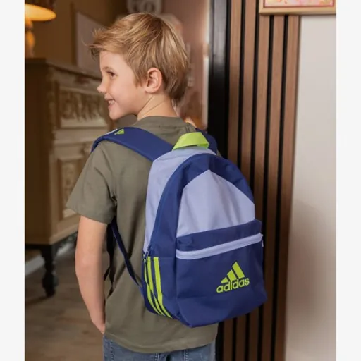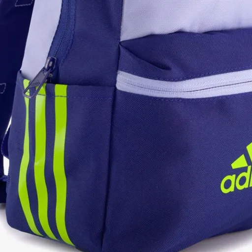 Blauwe Adidas Classic Badge of Sport rugzak met groene accenten. Voorzien van een stevige draaglus aan de bovenzijde en gewatteerde, verstelbare schouderbanden. De rugzak heeft een ruime hoofdvak met ritssluiting, een voorvak met rits en twee zijvakjes. Gemaakt van polyester. Afmetingen: 15 x 36 x 44 cm. Inhoud is 27.5 liter.