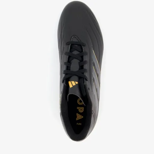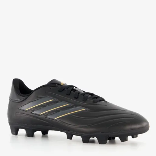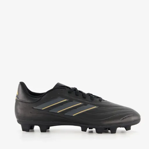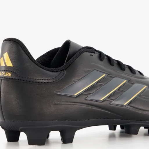 Zwarte Adidas Copa Pure 2 Club MG voetbalschoenen voor heren. Het buitenwerk is gemaakt van imitatieleer, het binnenwerk van textiel en de MG zool van rubber. De zool is geschikt voor stevige ondergronden als natuurgrasvelden en kunstgrasvelden. Voorzien van een vetersluiting en een uitneembare binnenzool van textiel. De schoenen worden versierd met goudkleurige accenten en de iconische 3-Stripes in het grijs en goud aan de buitenkant.