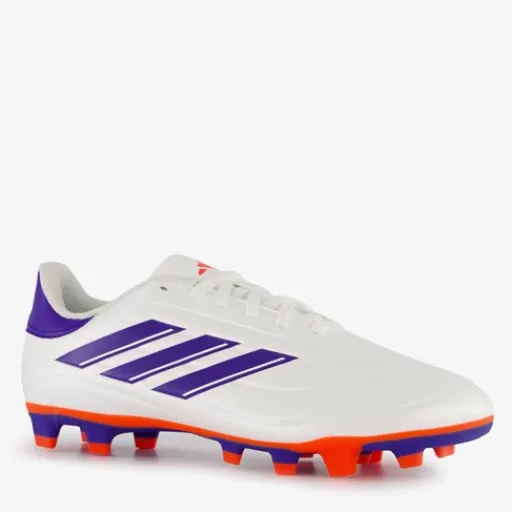Witte Adidas Copa Pure 2 Club MG voetbalschoenen voor heren. Het buitenwerk is gemaakt van imitatieleer, het binnenwerk van textiel en de MG zool van rubber. De veelzijdige zool is geschikt voor harde natuurgrasvelden, zachte natuurgrasvelden en kunstgrasvelden. Voorzien van een vetersluiting en een uitneembare binnenzool van textiel. De schoenen worden versierd met blauwe en oranje accenten en de iconische 3-Stripes in het blauw aan de buitenzijde.