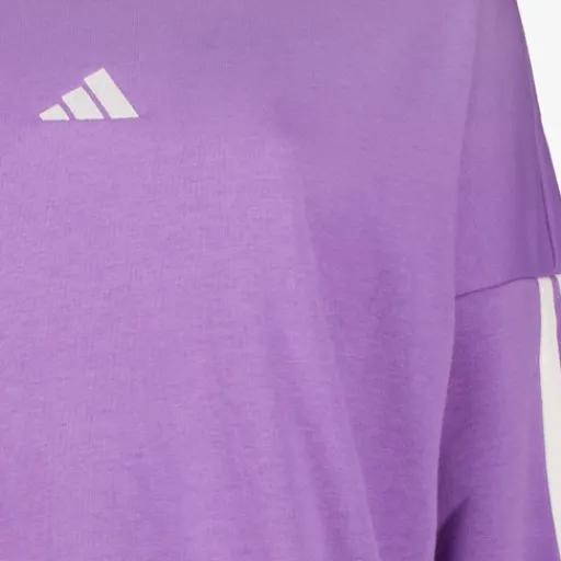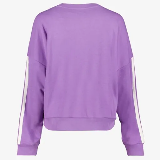 Paarse sweater voor dames van Adidas. Voorzien van een ronde hals, lange mouwen met witte 3-Stripes langs de mouwen. De sweater heeft een merkopdruk op de borst en is gemaakt van 55% katoen, 36% polyester en 9% viscose.