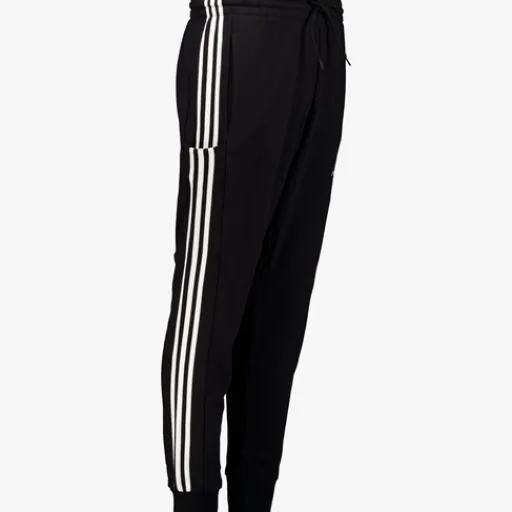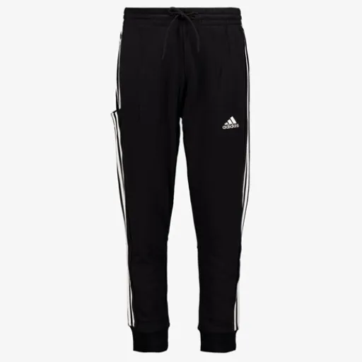 Zwarte Adidas Essentials 3-Stripes French Terry joggingbroek voor heren. Voorzien van een elastische tailleband met aantrekkoordjes en twee zijzakken. De broek heeft geribbbelde boorden met elastiek en een normale pasvorm. Op de zijkanten zijn de iconische Adidas 3-Stripes aangebracht en op het bovenbeek zit een merkopdruk. Gemaakt van 100% katoen.