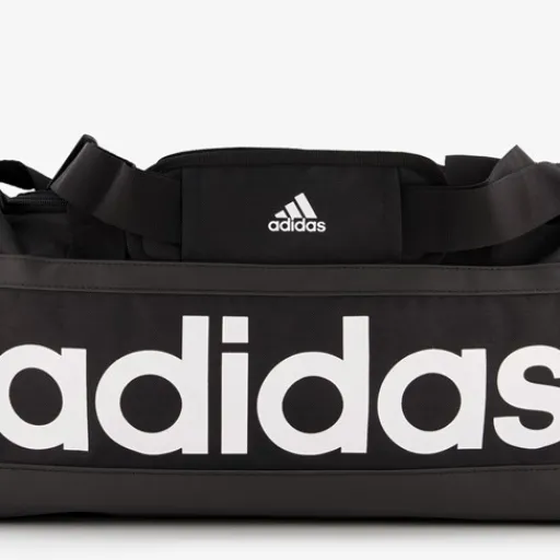 Zwarte Adidas Essentials Linear Duffel S sporttas. Voorzien van twee handvaten bovenop die je met een klittenband aan elkaar vast kan maken en een verstelbare schouderband. De tas heeft een ruime hoofdvak met een dubbele ritssluiting en een zijvak met rits. In het hoofdvak vind je o.a. een apart vak voor je schoenen en een meshvakje waar jij eventueel jouw drinkfles in kwijt kan. Afmetingen: 45 x 23 x 20 cm. Inhoud is 25 liter. Gemaakt van polyester.