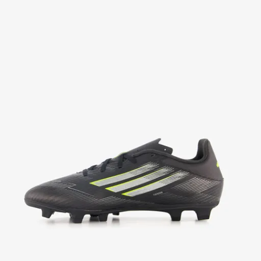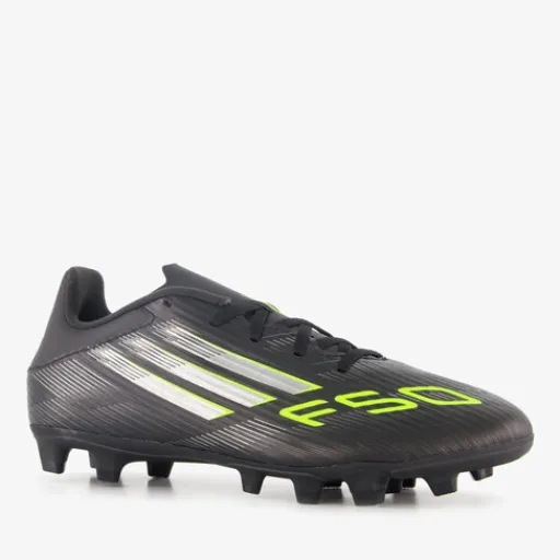 Zwarte Adidas F50 Club voetbalschoenen voor heren. Het buitenwerk is gemaakt van imitatieleer, het binnenwerk van textiel en de Multi Ground (MG) zool van rubber. De MG noppenconstructie is geschikt voor natuurgras- en kunstgrasvelden. Voorzien van een vetersluiting en een uitneembare binnenzool van textiel. De schoenen hebben groene merkopdrukken en witte Adidas 3-Stripes op de zijpanden.