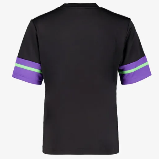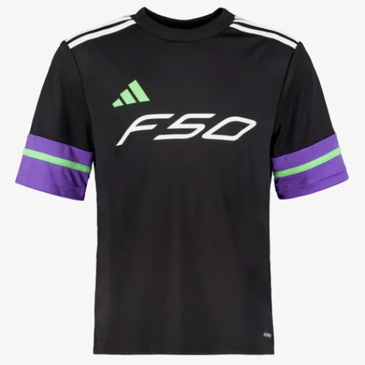 Zwart Adidas F50 JSY Y voetbal T-shirt voor kinderen. Voorzien van een ronde hals en korte mouwen. Het shirt heeft merkopdrukken en groene en paarse details. Daarnaast is het voetbalshirt vervaardigd met AEROREADY-technologie, die zweet afvoert en je droog en comfortabel houdt. Gemaakt van 100% polyester.
