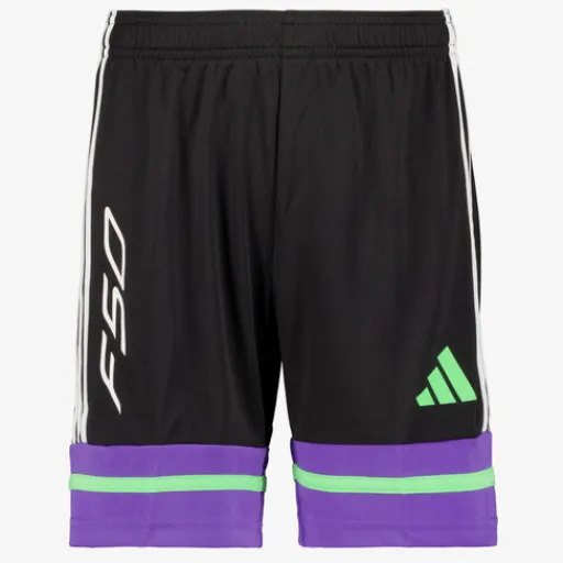 Zwarte Adidas F50 SHO Y voetbalshort voor kinderen. Voorzien van een elastische tailleband, merkopdrukken en groene en paarse details. De sportshort is vervaardigd met AEROREADY-technologie, die zweet afvoert en je droog en comfortabel houdt. Gemaakt van 100% polyester.