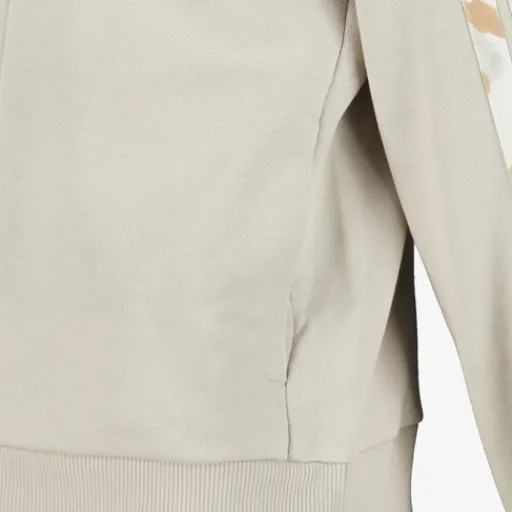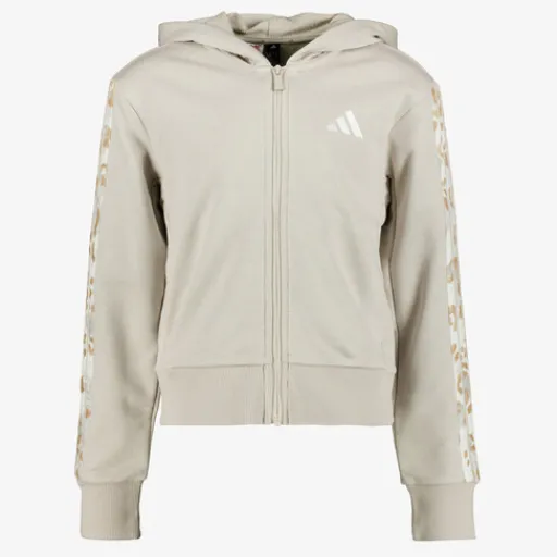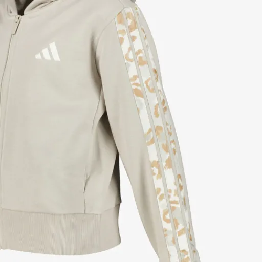 Beige Adidas G ANML 3S FT HD sportvest voor kinderen. Voorzien van een capuchon met aantrekkoordjes, een ritssluiting en steekzakken aan de voorkant. De vest heeft witte Adidas 3-Stripes met een panterprintje op de mouwen. Gemaakt van 55% katoen, 36% polyester en 9% viscose.