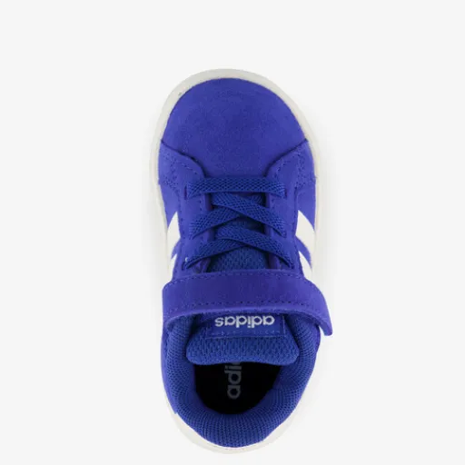 Blauw-witte Adidas Grand Court 00s sneakers voor kinderen. Het buitenwerk is gemaakt van van suède, het binnenwerk van textiel en de stevige buitenzool is van rubber. Voorzien van elastische veters en een klittenbandsluiting voor een optimale pasvorm. De sneakers hebben een goudkleurige merkopdruk op de hak en aan de zijkanten zijn de iconische Adidas 3-Stripes aangebracht. Het comfortabele voetbed van textiel is uitneembaar.