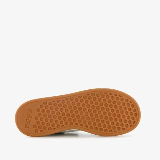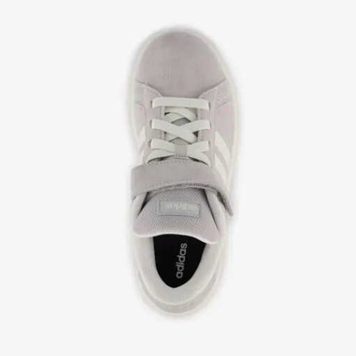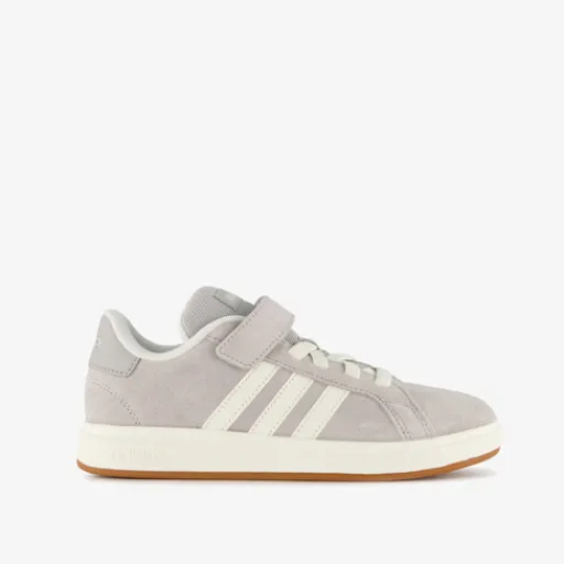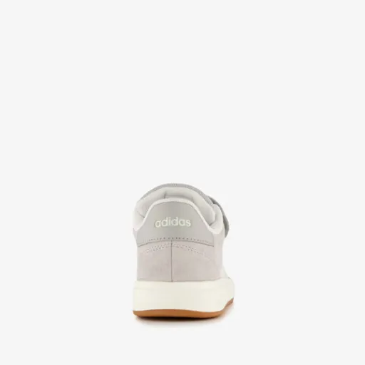 Grijze Adidas Grand Court 00s sneakers voor kinderen. Het bovenwerk is gemaakt van suède en imitatieleer, het binnenwerk van textiel end e stevige zool met profiel is van rubber. Voorzien van elastische veters en een klittenbandsluiting voor een optimale pasvorm en een comfortabele binnenzool van textiel. Deze is uitneembaar. De sneakers hebben een wit-bruine buitenzool, witte accenten en op de zijpanden zijn witte Adidas 3-Stripes aangebracht.