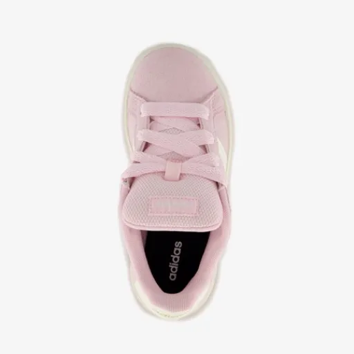 Roze Adidas Grand Court 00s meisjes sneakers. Het buitenwerk is gemaakt van suède, het binnenwerk van textiel en de stevige zool met profiel is van rubber. Voorzien van een vetersluiting en comfortabele binnenzool van textiel. Deze is uitneembaar. De sneakers hebben een gewatteerde tong en het buitenwerk wordt versierd en een wit met bruine buitenzool.