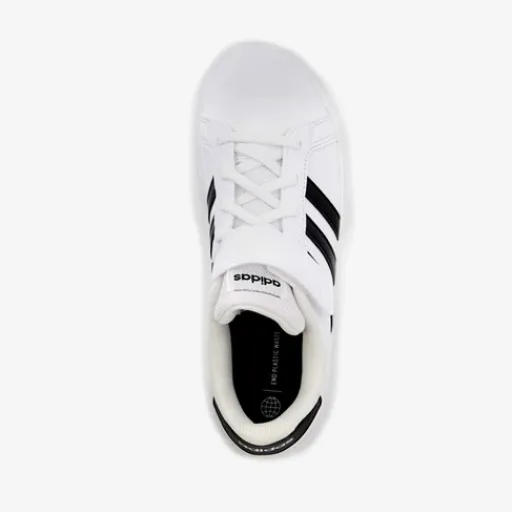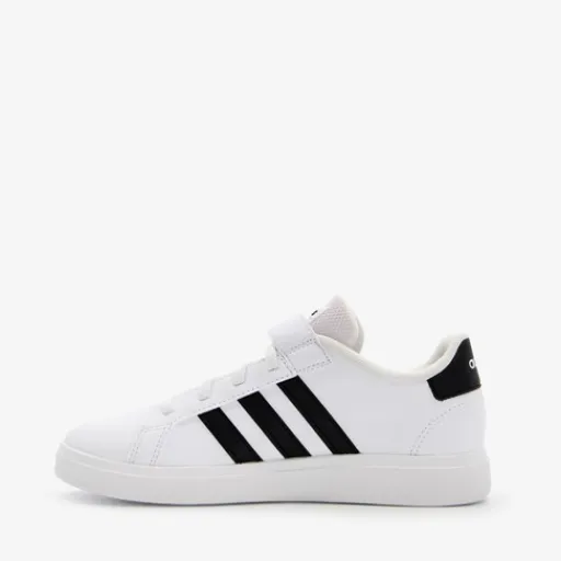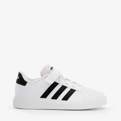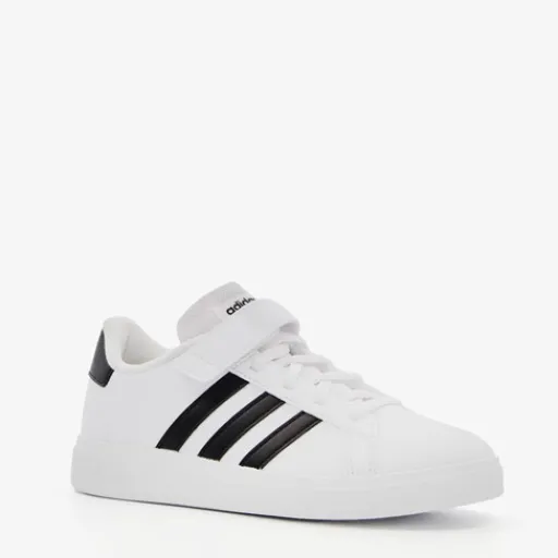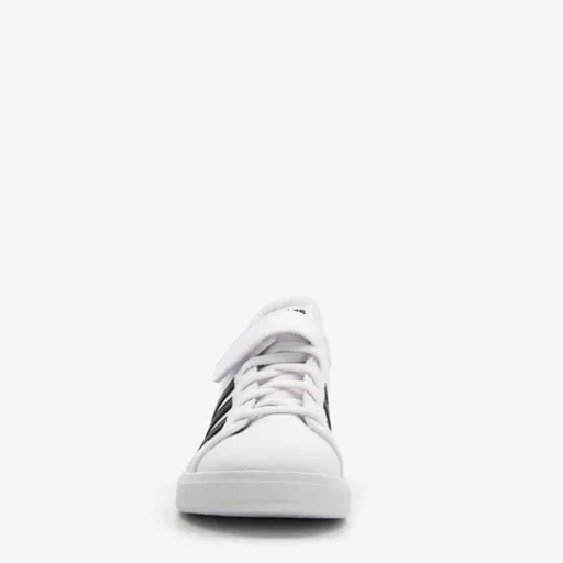 Witte Adidas Grand Court 2.0 sneakers voor kinderen. Gemaakt van imitatieleer met een binnenwerk van textiel en stevige profielzool van rubber. Voorzien van een veter- en klittenbandsluiting voor een goede pasvorm en de iconische Adidas 3-stripes in het zwart op de zijpanden. Het comfortabele voetbed is van textiel. Deze is uitneembaar.