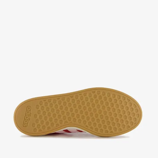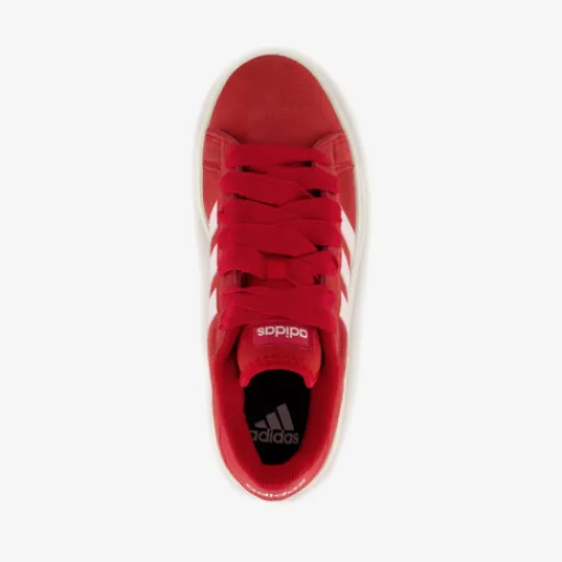 Rode Adidas Grand Court Base 00s sneakers voor dames. Gemaakt van suede, een binnenwerk van textiel en een rubberen zool. De sneakers hebben een vetersluiting en vast voetbed van textiel. Verfraaid met de witte Adidas 3-Stripes op de zijpanden. De sneakers hebben een klassieke rubberen cupzool voor een sportieve look.