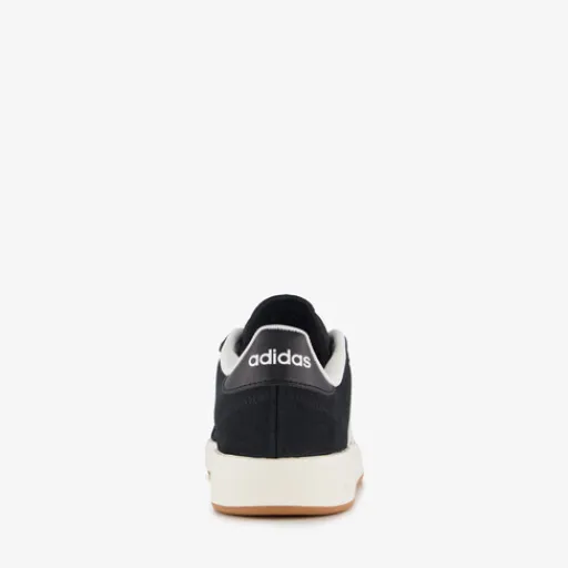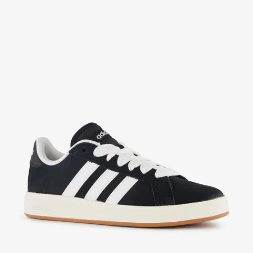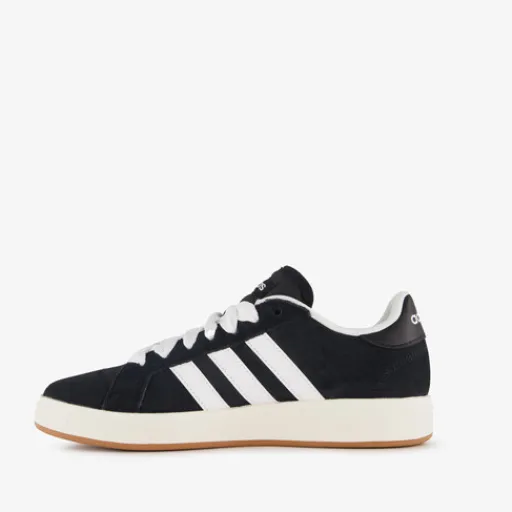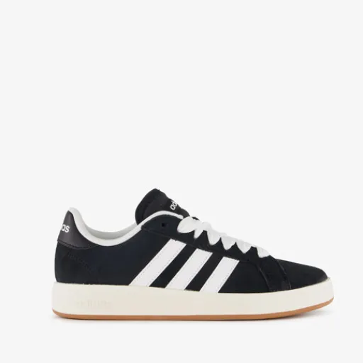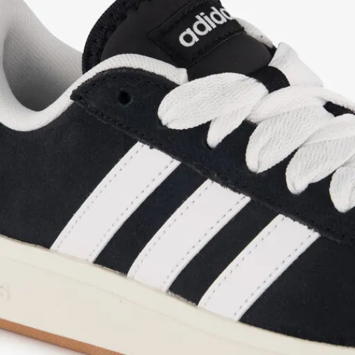 Zwart-witte Adidas Grand Court Base 00s sneakers voor dames. Het bovenwerk is gemaakt van suède, het binnenwerk van textiel en de profielzool is van rubber. Voorzien van een vetersluiting en een comfortabele binnenzool van textiel. Deze is niet uitneembaar. De sneakers hebben een wit-bruine buitenzool en aan de zijkanten zijn witte Adidas 3-Stripes aangebracht.
