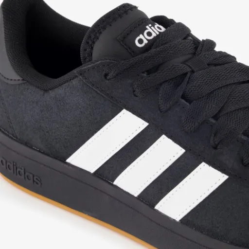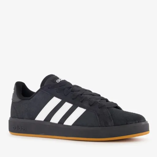 Zwarte Adidas Grand Court Base 00s sneakers voor heren. Het buitenwerk is gemaakt van suede, het binnenwerk van textiel en de stevige zool met profiel is van rubber. Voorzien van een vetersluiting en een uitneembare binnenzool met Soft Foam. Deze biedt demping en comfort. Deze gevoerde sneakers hebben witte merkopdrukken, een bruine buienzool en witte Adidas 3-Stripes op de zijpanden.