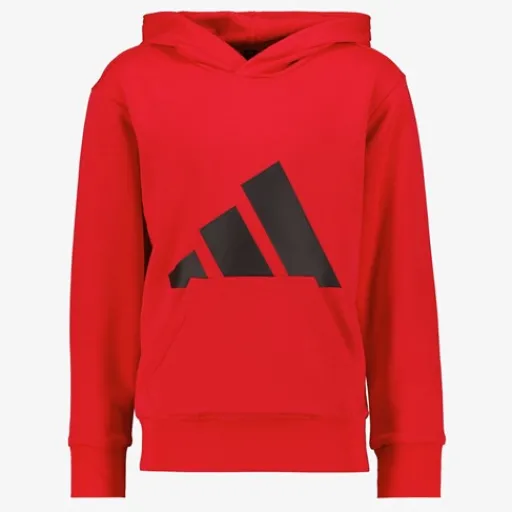 Rode Adidas J SL FL hoodie voor kinderen. Voorzien van een capuchon met aantrekkoordjes en een buidelzak aan de voorzijde. De hoodie heeft een zwarte merkopdruk op de borst en is gemaakt van 55% katoen, 36% polyester en 9% viscose.