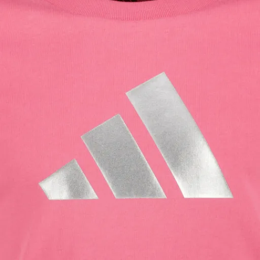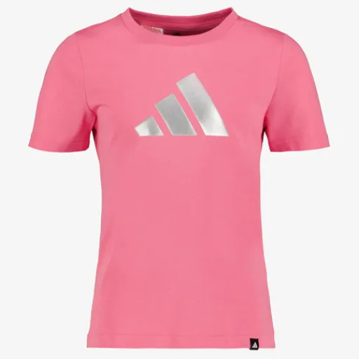 Roze Adidas JG Glam T Pinkfus sport T-shirt voor meisjes. Voorzien van een ronde hals en korte mouwen. Het shirt heeft een zilverkleurige merkopdruk aan de voorzijde en is gemaakt van 100% katoen.