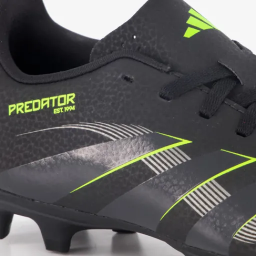 Zwarte Adidas Predator Club voetbalschoenen voor kinderen. Gemaakt van imitatieleer met een binnenwerk van textiel en een Multi Ground (MG) zool van rubber. Voorzien van een vetersluiting en een comfortabele, uitneembare binnenzool van textiel. De veldschoenen hebben groene details en Adidas 3-Stripes op de zijpanden.