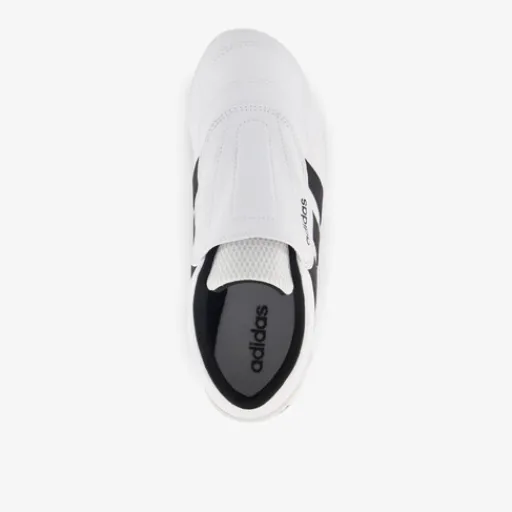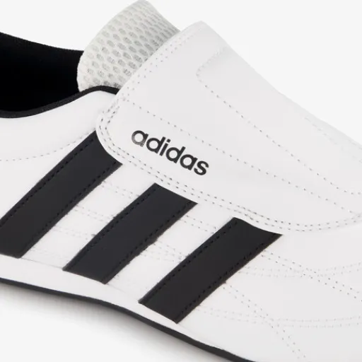 Witte Adidas Tekwen sneakers voor dames. Gemaakt van imitatieleer, een binnenwerk van textiel en een rubberen zool. De sneakers hebben een elastische sluiting en vast voetbed van textiel. Voorzien van zwarte merkaccenten op het bovenwerk.