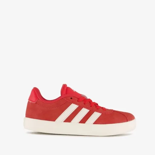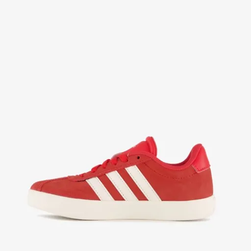 Rode Adidas VL Court 3.0 sneakers voor jongens. Het buitenwerk is gemaakt van imitatieleer, het binnenwerk is van textiel en de stevige zool met profiel is van rubber. Op de hak en bij de tenen zijn suède inzetten aangebracht. Voorzien van een vetersluiting en een uitneembare binnenzool van textiel. De sneakers hebben witte Adidas 3-Stripes aan de zijkanten en een witte buitenzool.