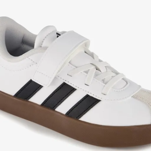 Witte Adidas VL Court 3.0 sneakers voor kinderen. Het buitenwerk is gemaakt van imitatieleer, het binnenwerk is van textiel en de stevige zool met profiel is van rubber. Op de hak en bij de tenen zijn suède inzetten aangebracht. Voorzien van elastische veters met klittenband en een comfortabele binnenzool van textiel. Deze is uitneembaar zodat je jouw eigen zolen in de schoenen kan dragen. De schoenen hebben de iconische Adidas 3-Stripes aan de zijkanten en een bruine buitenzool.¶¶