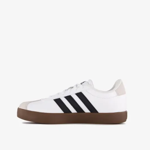 Witte Adidas VL Court 3.0 sneakers voor kinderen. Het buitenwerk is gemaakt van imitatieleer, het binnenwerk is van textiel en de stevige zool met profiel is van rubber. Op de hak en bij de tenen zijn suède inzetten aangebracht. Voorzien van een vetersluiting en een comfortabele binnenzool van textiel. Deze is uitneembaar zodat je jouw eigen zolen in de schoenen kan dragen. De schoenen hebben de iconische Adidas 3-Stripes aan de zijkanten en een bruine buitenzool.