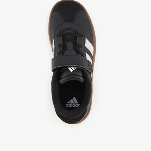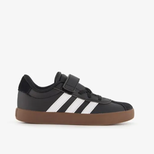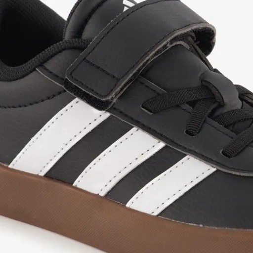 Zwarte Adidas VL Court 3.0 sneakers voor kinderen. Het buitenwerk is gemaakt van imitatieleer, het binnenwerk is van textiel en de stevige zool met profiel is van rubber. Op de hak en bij de tenen zijn suède inzetten aangebracht. Voorzien van elastische veters en een klittenbandsluiting voor een optimale pasvorm. De comfortabele binnenzool van textiel is uitneembaar. De schoenen hebben de iconische Adidas 3-Stripes aan de zijkanten en een bruine buitenzool.