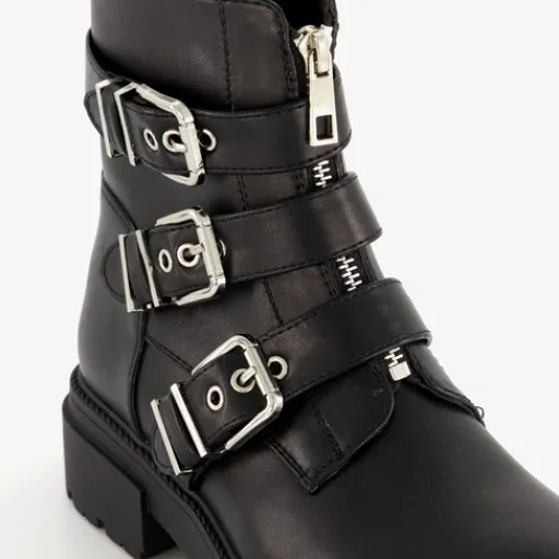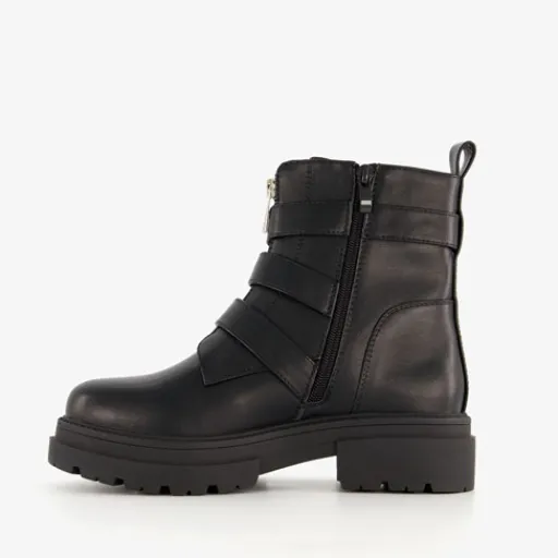 Zwarte biker boots voor dames. Gemaakt van imitatieleer, een binnenwerk van textiel en een rubberen zool. De boots hebben een ritssluiting aan de binnenzijde en een sierrits met gespen. Het vaste voetbed is gemaakt van imitatieleer. De biker boots hebben een schachthoogte van 15 cm en een lage hak van circa 2 cm.