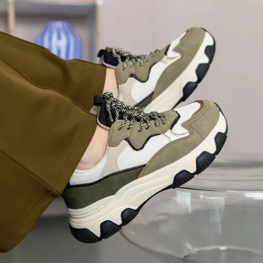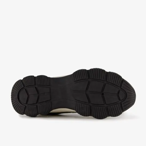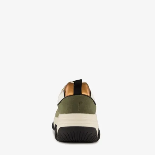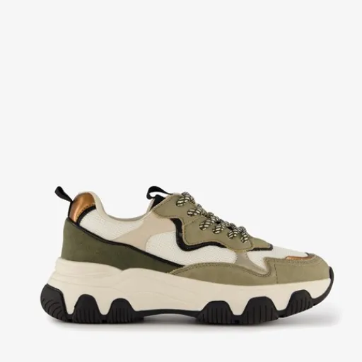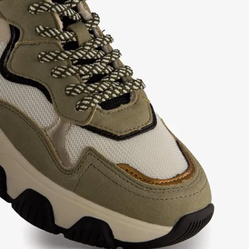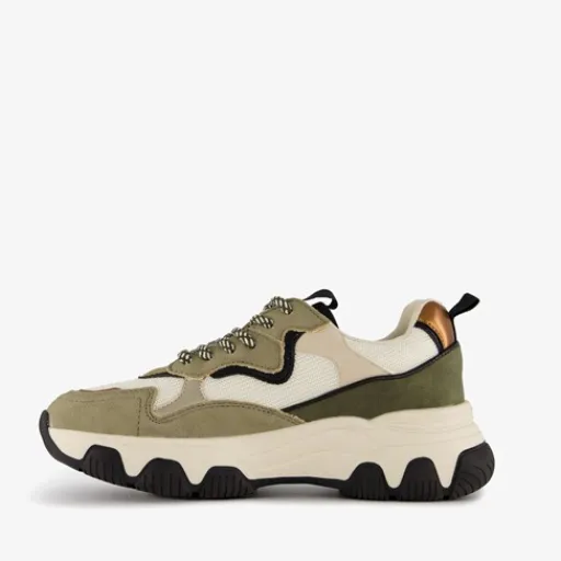 Kaki groene dad sneakers voor dames. Gemaakt van imitatieleer, een binnenwerk van textiel en een rubberen zool. De dad sneakers hebben een vetersluiting en comfortabel voetbed van textiel. Deze is niet uitneembaar. De dad sneakers hebben aantreklusjes op de hiel en tenen en een grove zool met zwarte accenten.
