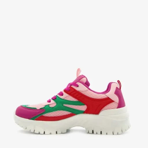 Dad sneakers voor dames van Blue Box in de trendkleuren roze en groen. Gemaakt van imitatieleer, een binnenwerk van textiel en een rubberen zool. De sneakers hebben een vetersluiting en lusjes op de hiel en tong voor een makkelijke instap. Het comfortabele voetbed is gemaakt van textiel. Deze is niet uitneembaar. De dad sneakers hebben rode accenten en een chunky zool.