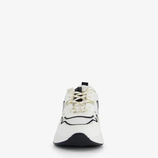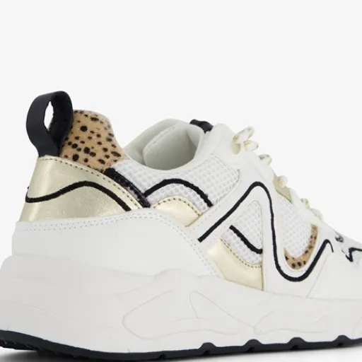 Witte dad sneakers uit de Blue Box collectie. Deze mooie damesschoenen worden versierd met panterprint, goudkleurige en zwarte details. Het buitenwerk is gemaakt van textiel en imitatieleer, het binnenwerk van textiel en de stevige profielzool van rubber. Voorzien van een vetersluiting, hiellusjes en een uitneembare voetbed.