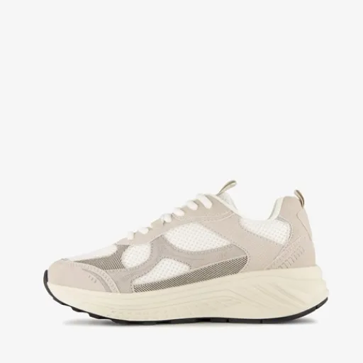 Witte dad sneakers voor dames. Gemaakt van imitatieleer, een binnenwerk van textiel en een rubberen zool. De sneakers hebben een vetersluiting en hiellusje. Het voetbed is uitneembaar en gemaakt van textiel. Voorzien van mesh inzetten op het bovenwerk en grijze details.