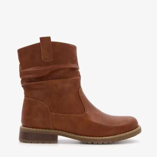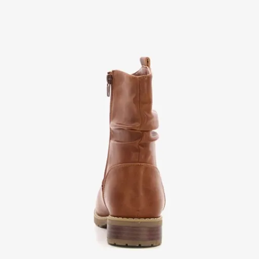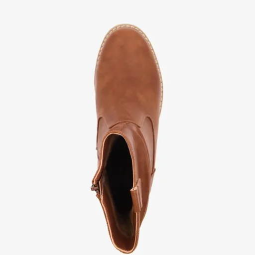 Cognac bruine enkellaarzen voor dames. Gemaakt van imitatieleer, een binnenwerk van textiel en een rubberen zool. De laarsjes hebben een ritssluiting aan de binnenzijde en een vast voetbed van textiel. De schachthoogte bedraagt 16 cm. De enkellaarsjes hebben een lage hak van circa 2 cm.