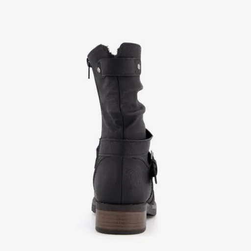 Zwarte enkellaarsjes voor dames van Blue Box. Gemaakt van imitatieleer, een binnenwerk van textiel en een stevige profielzool. De laarsjes hebben een ritssluiting aan de binnenzijde en een bandje met gesp rondom de enkel. De vaste binnenzool is gemaakt van textiel. De enkellaarsjes hebben een schachthoogte van 18 cm en een laag hakje van circa 2 cm.