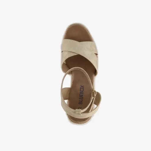 Goudkleurige espadrilles met een hoge sleehak voor dames uit de Blue Box collectie. De sandalen zijn gemaakt van textiel en hebben een gevlochten jutte zool met een rubberen buitenzool. Voorzien van cross-over bandjes bij de tenen en een enkelband met gespsluiting. Het comfortabele voetbed van textiel is niet uitneembaar. De espadrilles hebben een sleehak van circa 10 cm hoog.