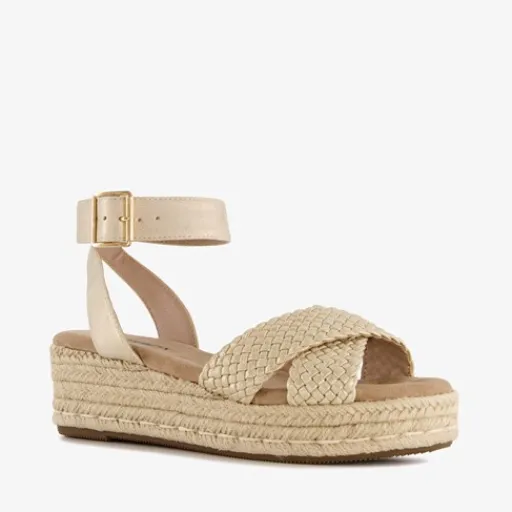 Goudkleurige espadrilles voor dames uit de Blue Box collectie. De sandalen zijn gemaakt van textiel en imitatieleer en hebben een gevlochten jute zool. Voorzien van gevlochten cross-over bandjes over de tenen en een enkelbandje met gespsluiting. Deze mooie espadrilles hebben een sleehak van circa 5,5 cm. Het comfortabele voetbed van textiel is niet uitneembaar.