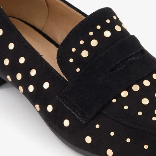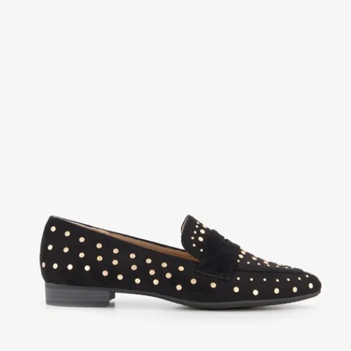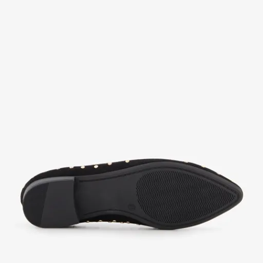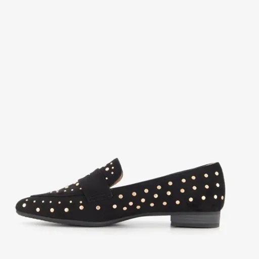 Zwarte dames loafers met goudkleurige studs uit de Blue Box collectie. Het buitenwerk is gemaakt van imitatiesuède, het binnenwerk van textiel en de buitenzool is van rubber. De loafers hebben een puntige neus en een laag hakje van circa 2 cm. Het comfortabele voetbed van textiel is niet uitneembaar.