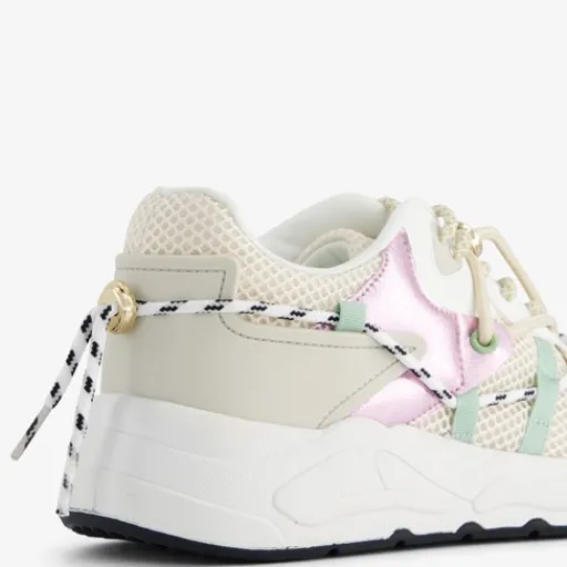 Dad sneakers met veters rondom. Gemaakt van imitatieleer en textiel, een binnenwerk van textiel en een rubberen zool. De sneakers hebben een vetersluiting en uitneembaar voetbed van imitatieeer. Voorzien van pastel lila en mintgroene accenten op het bovenwerk en een decoratieve veter rondom de schoen.